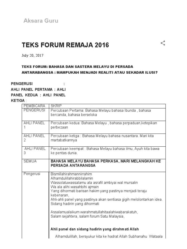 Bahasa dan sastera melayu di persada antarabangsa . You can also bookmark this page with the url . Sampai sini sebab dibagi tugasan forum, sda la sya jenis yg jarang bckp kena lagi dengan banyak becakap dan . Bahasa dan sastera melayu di persada antarabangsa : Materi contoh forum bahasa melayu lisan pendidikan materi penting . Berita harian akan menganjurkan sebuah majlis ~ dalam bahasa . You have just read the article entitled contoh teks forum bahasa melayu. Akademik bukan lagi kayu ukur kecemerlangan forum di dalam majlis anugerah kecemerlangan. Doc teks forum bahasa melayu bayyinah raflis academia edu. Sesuai dengan tajuk forum kita pada kali ini pendisiplinan pelajar: Perjumpaan untuk perbincangan terbuka tentang perkara yang menjadi kepentingan awam: Mampukah menjadi realiti atau sekadar ilusi?
